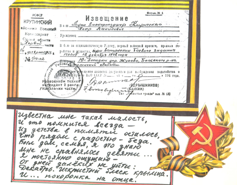 Много бед и страданий принесла она нашему народу. Мы потеряли почти 27 миллионов человек, и среди них 3736 крутинцев! Война оставила за собой разрушенные города и села, разбитые судьбы, беспризорных детей. И нет на русской земле семьи, в которой бы долгих 70 лет не оплакивали павших…