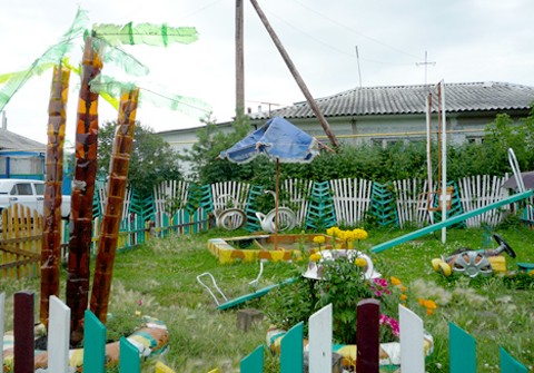 Свое путешествие по поселку я начала с улицы Красный путь. Многие дома поразили своей ухоженностью и красотой, но особое внимание привлек дом 147/1с детской площадкой, на которой даже «растут» пальмы из пластиковых бутылок. Не успела я сделать несколько снимков, как ко мне вышли хозяева дома. Евутжан Ергалиева призналась, что инициатором строительства был муж Егызбай: