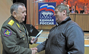 На снимках: участник битвы под Москвой Иван Павлович Шакин; председатель областного Совета ветеранов Н. Калиниченко вручает медаль «За оборону Москвы» сыну И.П. Шакина - Валерию