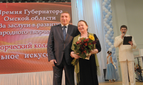 Вскоре диктор пригласила гостей и участников на торжественную церемонию награждения лауреатов премии губернатора Омской области «За заслуги в развитии народного творчества», премии имени Н.К. Бревновой, победителей пятого областного конкурса среди культурно-досуговых учреждений Омской области. Крутинский народный хор и Сингульский клуб Шипуновского сельского поселения (заведующая Ольга Задворнова - на верхнем снимке) тоже были удостоены премий и наград.