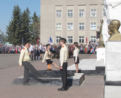 Наступает торжественный момент. Глава администрации муниципального района В.Н. Киселев возглавляет процессию возложения венков к мемориалу. Старшеклассники несут к подножию обелиска хвойные гирлянды. За ними идут с венками представители всех трудовых коллективов.