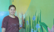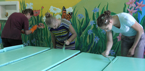Вся перепачканная красками, она кладет яркий цветочный декор на стены. Ей помогает семиклассница Жанна Гефлинг. А рядом энергично орудуют малярными кисточками девятиклассницы Любовь Саутина и Ирина Самохвалова. Они красят школьные столы.