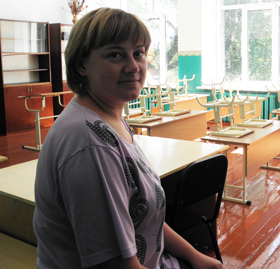 В фойе «художничает» Виктория Пахмурная. Исконная горожанка, она вышла замуж за нашего земляка и своего коллегу Евгения Пахмурного, уроженца села Рыжково, и уже второй год преподает здесь русский язык и литературу.