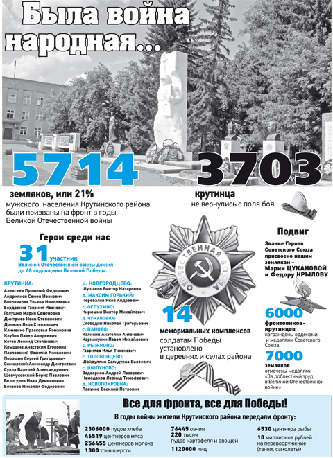 К сожалению, никто из нас не властен над временем. Стареют и уходят из жизни те, кто был непосредственными участниками тех 40-х грозовых. Сегодня в нашем районе их остаются единицы. Редеют ряды и тружеников тыла, детей и сирот войны. Но в нашей памяти и в наших сердцах никогда не должен погаснуть свет Великой Победы, мужество павших и бесконечная благодарность и признательность поколению победителей. Святой и священный долг каждого из нас – окружить заботой и вниманием живущих участников той жестокой войны. И пусть предстоящее празднование очередной годовщины Победы еще раз покажет, что и память наша крепкая, и милосердием мы не обделены.