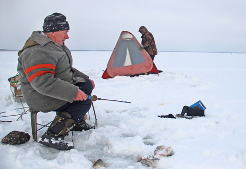 Рядом «пристыл» к лунке его конкурент Дмитрий Николаевич Кукушкин. Он профессиональный рыбак, работал на рыбзаводе, но уже шесть лет на пенсии, и здесь мерзнет в свое удовольствие. Наверное, ждет золотую рыбку.