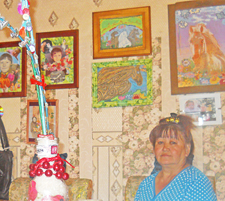 Все в ее интерьере наполнено ярким настроением. Это и шутливые куклы из сказки «Репка»: дед, баба, кошка да мышка. Это и вышитые гладью картины лошадей, фотоколлажи дорогих детей, которые никогда не говорят о своих проблемах маме, дабы ее не расстраивать. Эти семейные «реликвии» - на самом видном месте, напротив обеденного стола. На стене спальни - «медвежья шкура», выкроенная из старой шубы дочери. Рядом с нею – белоснежный лебедь – подвеска для кокетливой шляпки.