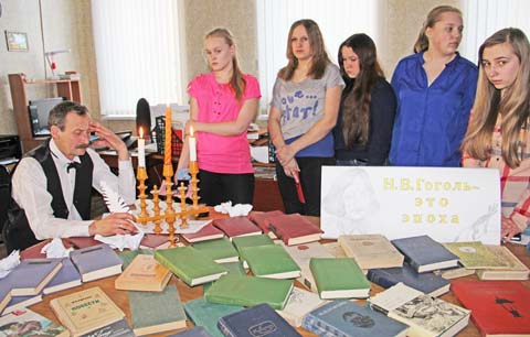 Первый сюрприз нас ждет в методическом отделе. Кипа разложенных книг, отблеск свечей, а во главе стола сам… Гоголь с большим пером в руках. В роли классика – Юрий Киселев. В глазах школьников – неподдельное любопытство. Улыбки, а порой и смех вызывали забавные факты биографии писателя, которые озвучивали ведущие. Николай Васильевич был незаурядной личностью.