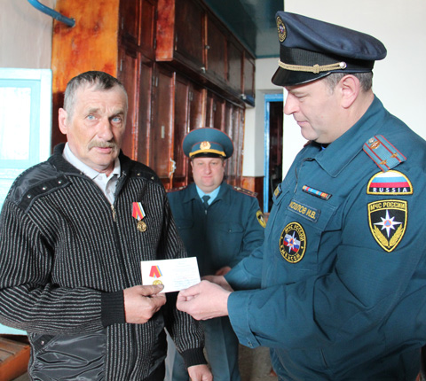 На снимке: начальник ПЧ-54 И.В. Козлов вручает медаль Ю.Д.Сорокину