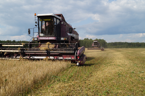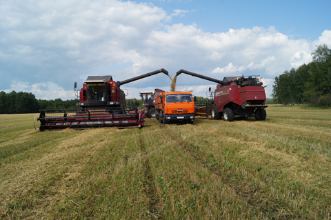 Накатанная полевая дорога ныряет в заросли кукурузы в человеческий рост и выводит на овсяное поле. Здесь, как говорится, пыль столбом. Звено из десяти комбайнов и пары КамАЗов домолачивает овес на делянке в 37 гектаров.