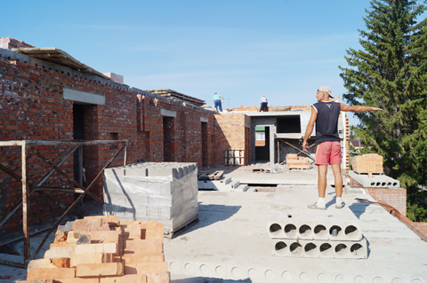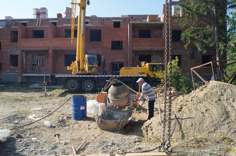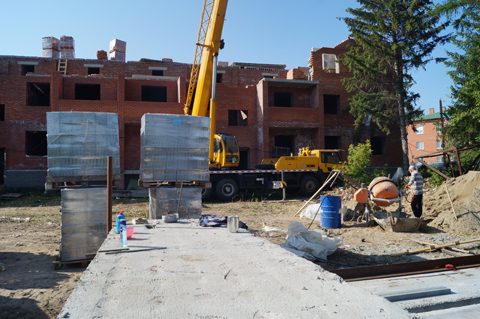 Сейчас его бригада в составе 12 человек достраивает третий этаж. К концу сентября, по заверениям бригадира, дом подведут под кровлю и начнутся отделочные работы.