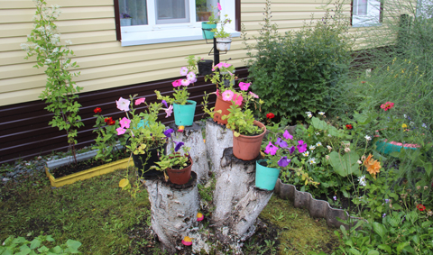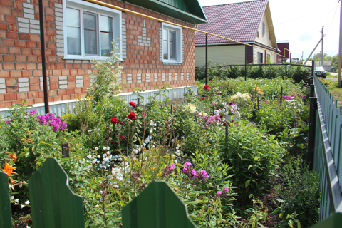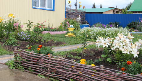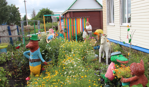 Ольга Ничкова с улицы Чапаева тоже участвует в конкурсе впервые. Сразу видно – в семье думают о детях. Много изделий из монтажной пены – вазонов, кукол. Нашлось место и старому велосипеду, на котором расположилась корзина с цветами. Рядом «кострище» из березовых поленьев, яркая беседка, лягушка из пэп-бутылок. В палисаде - качели, канат, домик, сказочные герои среди цветов.