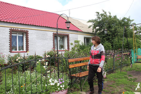Неподалёку утопает в цветах еще один замечательный домик в желто-зеленых тонах. Это постаралась Зинаида Клевакина. Как маленькие солнышки, расцветают у лавочки подсолнухи . Во дворе – беседка, качели, повсюду цветы. Даже на стволе рябины и крылечке. А водостоки ведут прямо... в прудик с уточками – и оригинально, и функционально. Дворик маленький, но очень уютный.