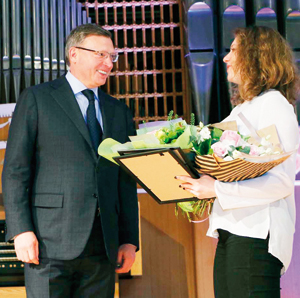 На снимке: А.Л. Бурков вручает награду Диане Камалетдиновой
